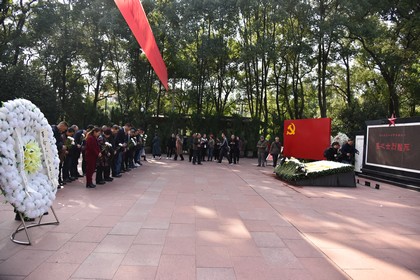 清風(fēng)寄哀思,翠柏傳敬意,烈士墓前,在莊嚴(yán)肅穆的氛圍中,全體人員脫帽肅立、默哀、向先烈敬獻(xiàn)花圈,再依次上前獻(xiàn)上寄托哀思的鮮花、行三鞠躬,并向右繞墓一周瞻仰烈士紀(jì)念墓,以表對英雄們的崇高敬意和深切懷念。